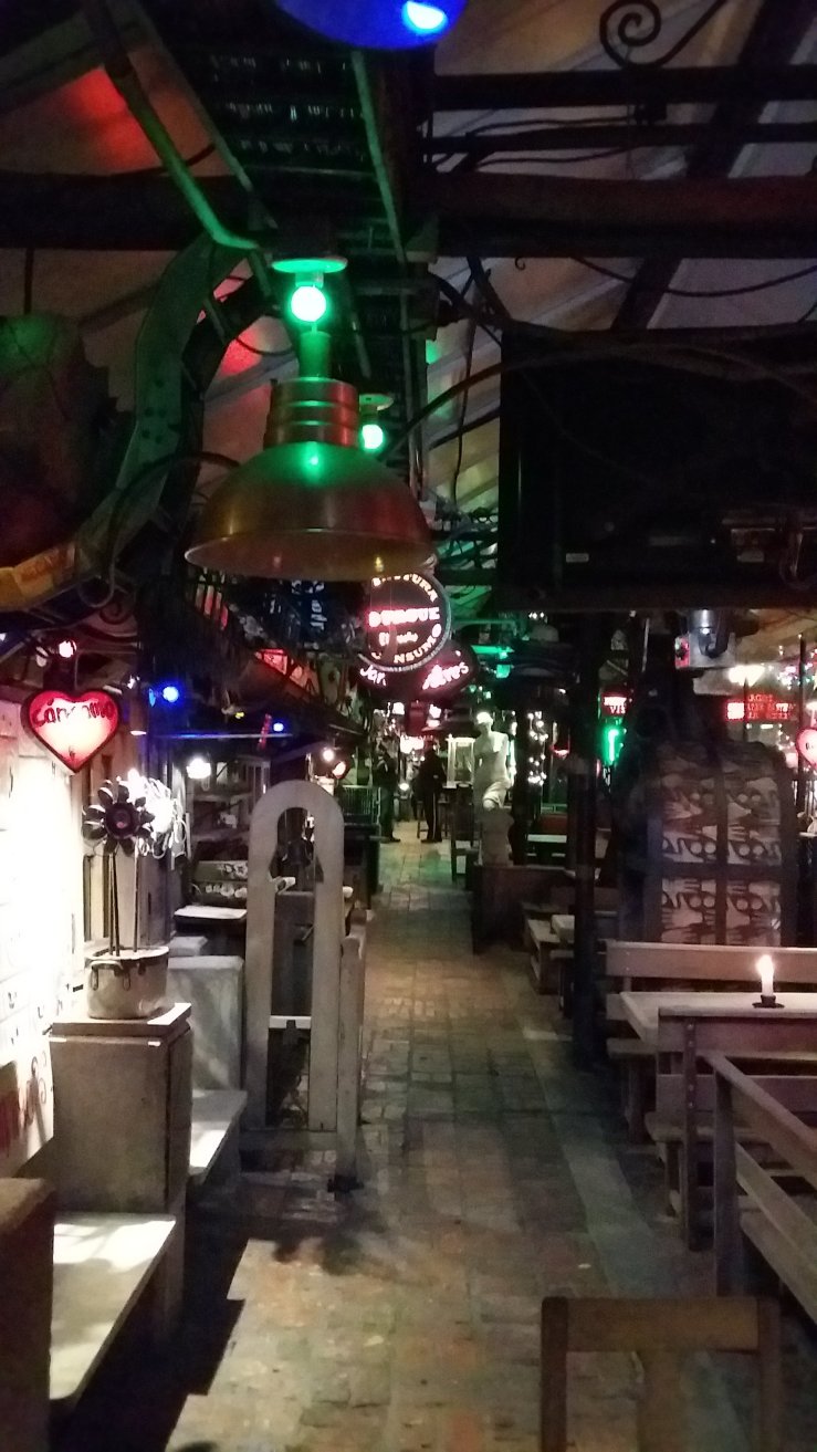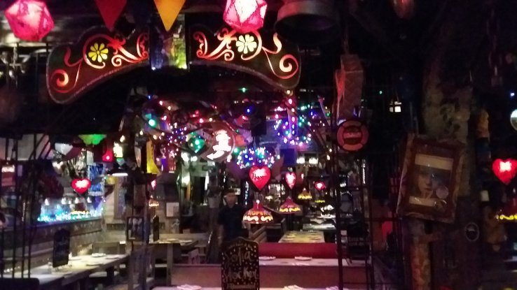 Un lieu kitchissime, incroyable musée du bric-à-brac, images pieuses, masques, fleurs et innombrables objets variés qui tient à la fois du restaurant, de la discothèque et du cirque.