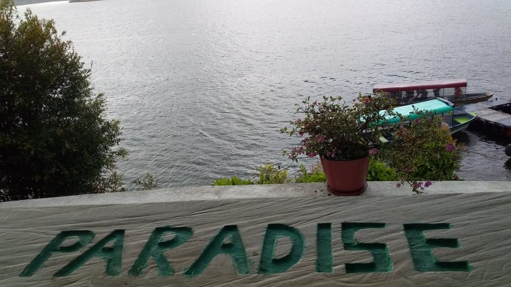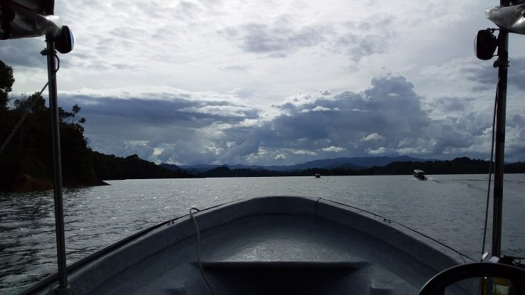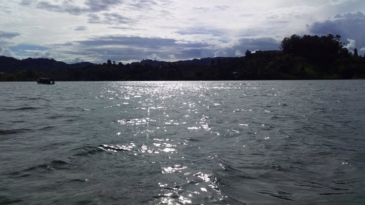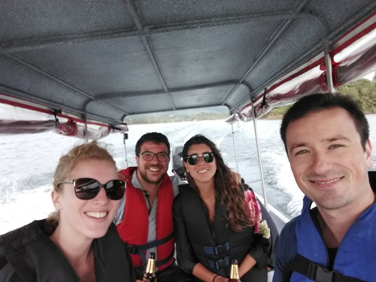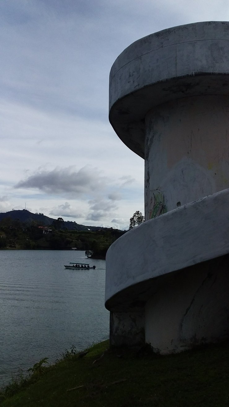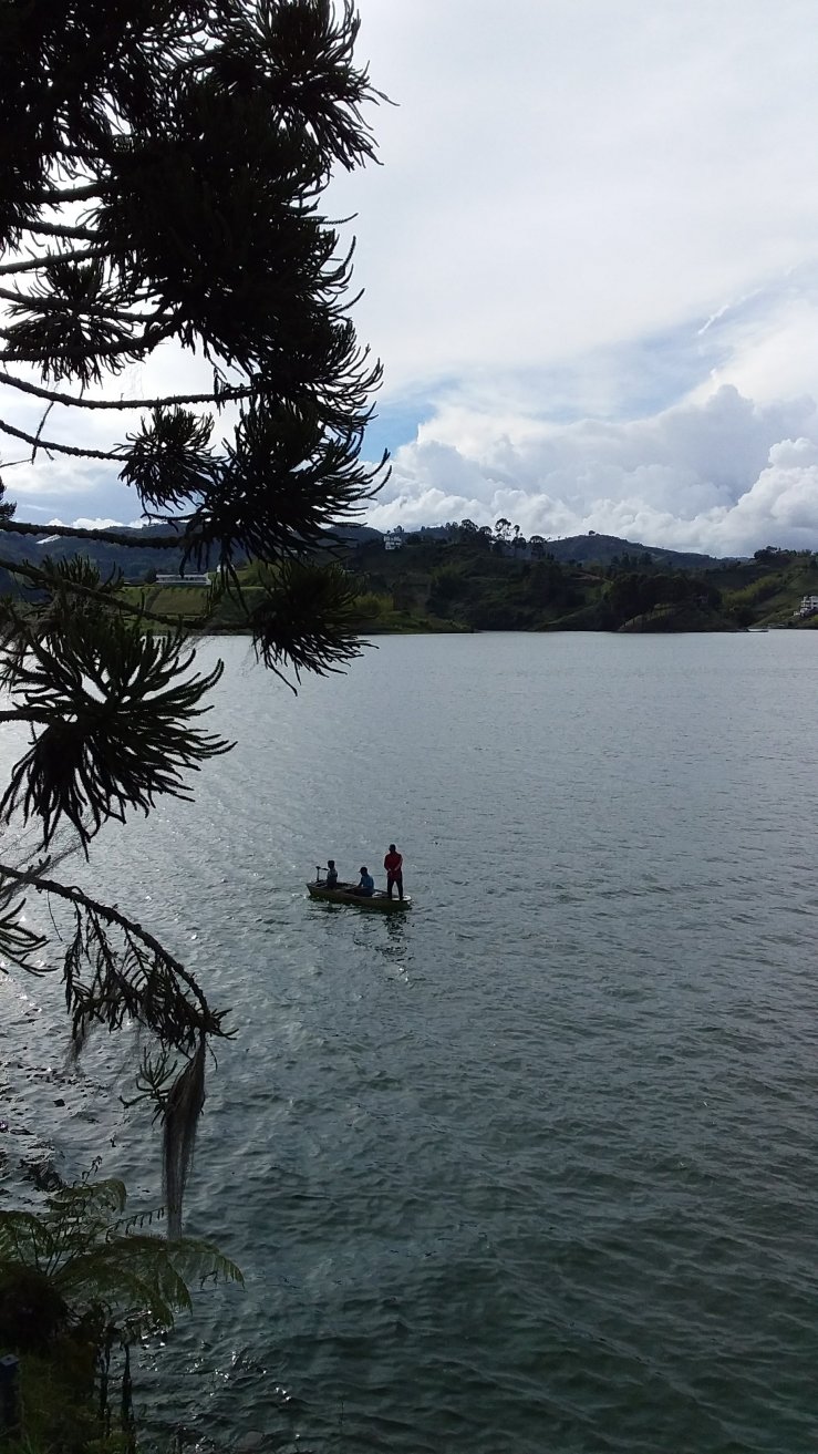 À Guatapé, une fois que nous avons visité le village, nous embarquons sur un bateau à moteur, la Mariana, direction la finca de Pablo Escobar.