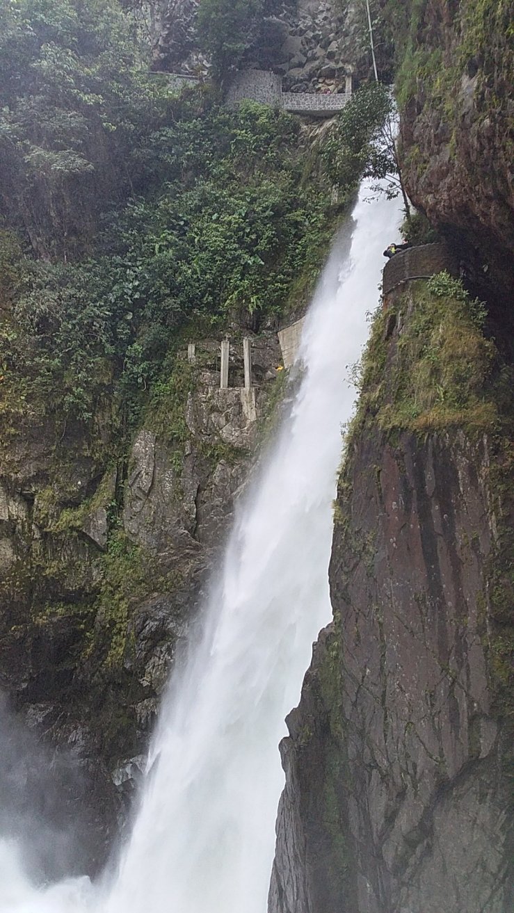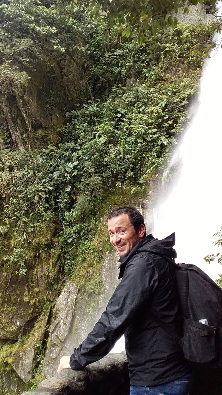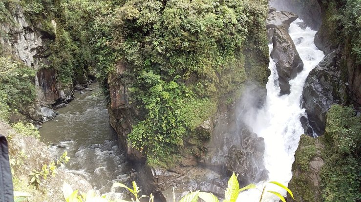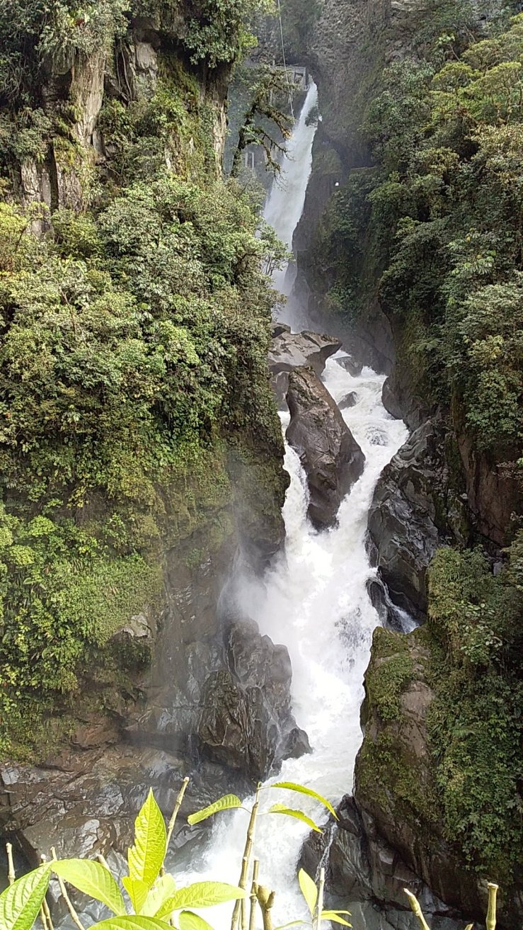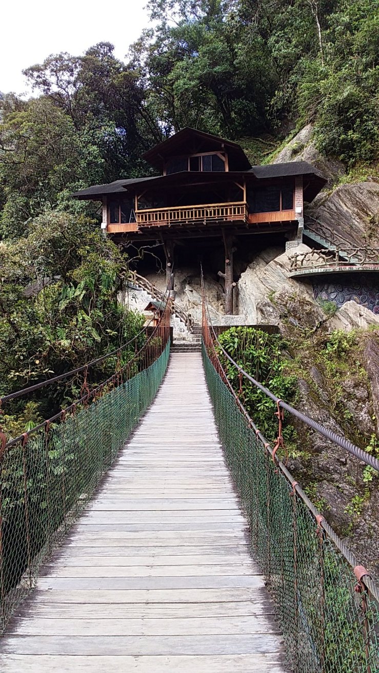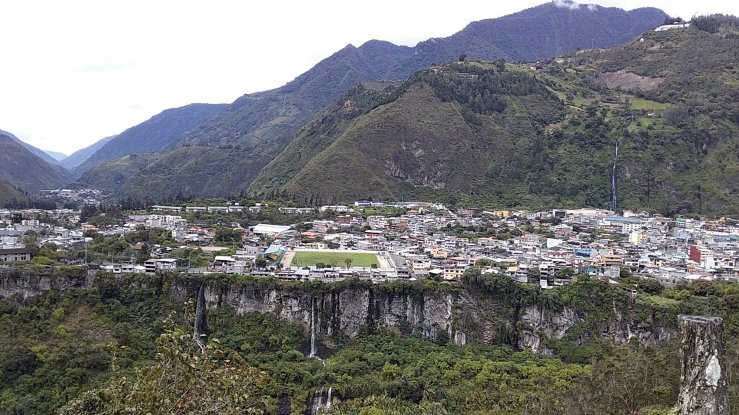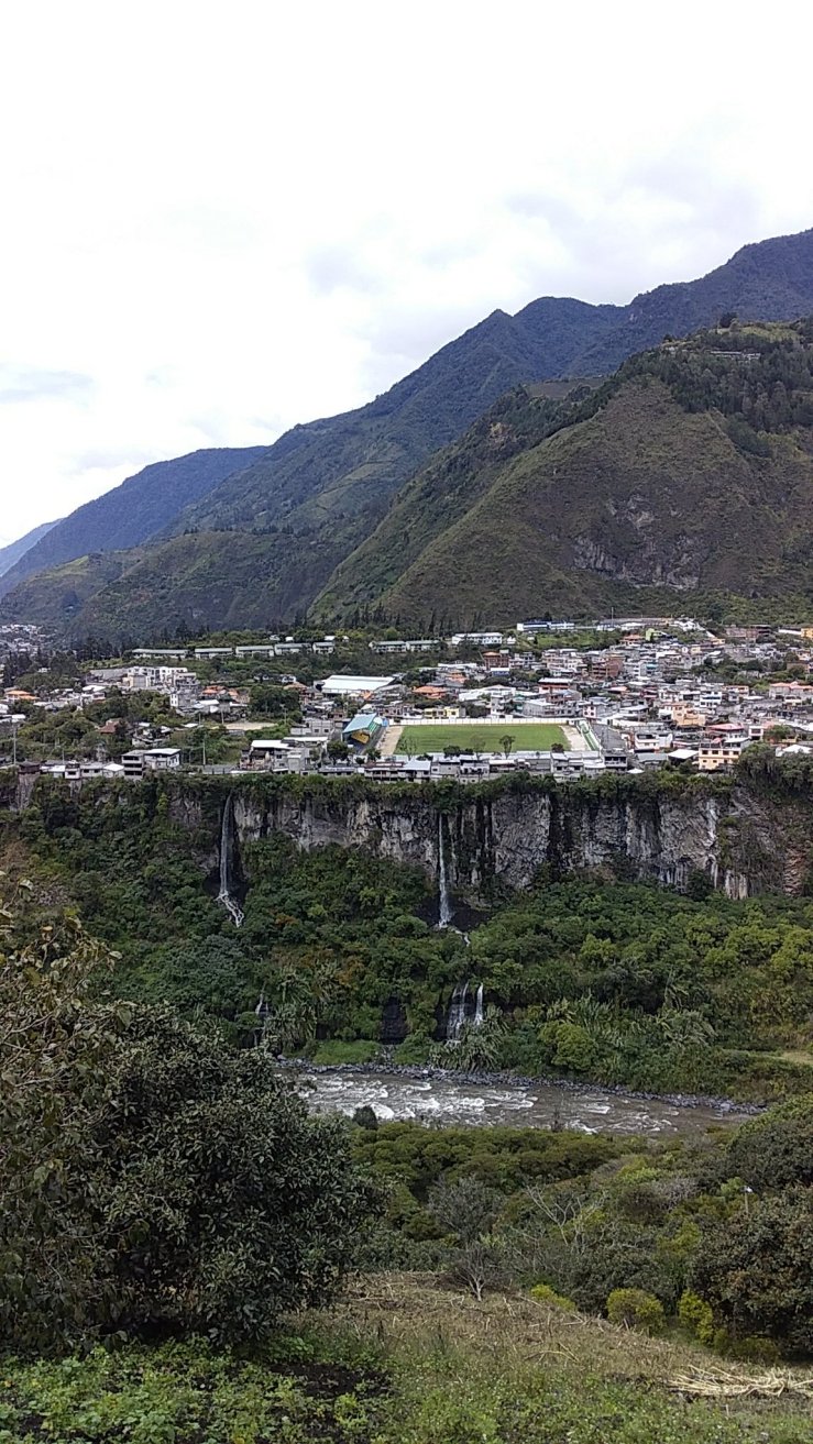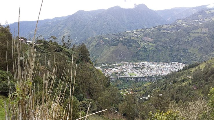 Baños, à environ 1820m d’altitude, est adossée au volcan Tungurahua, elle est à la frontière entre les Andes et l’Amazonie, il y fait donc chaud et humide et il pleut au moins une fois par jour, ce qui donne à la végétation un côté tropical exubérant comparé aux plateaux désertiques de la sierra.