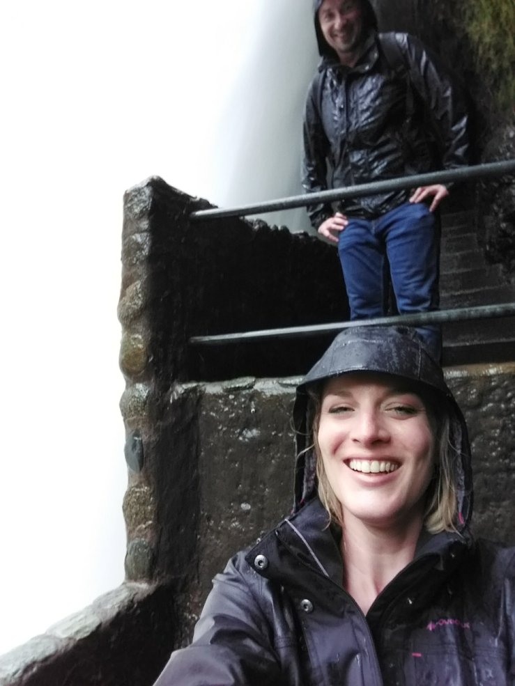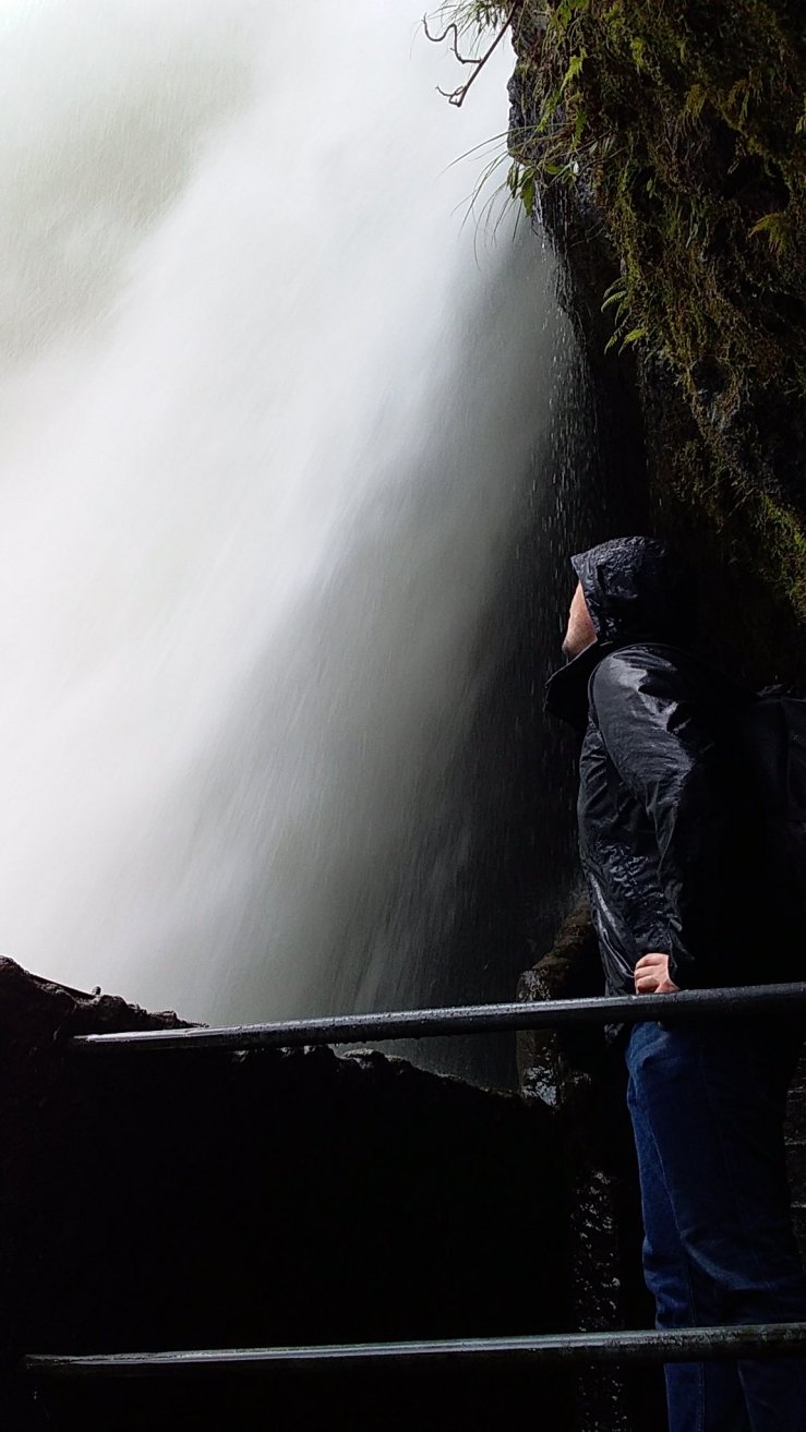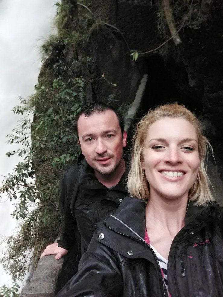 Nos tenues d’aventuriers pour descendre au Pailón del Diablo, la fameuse cascade de 60m, on l’on peut passer par des grottes de 80cm de haut et se retrouver derrière la cascade en pleine tourmente!