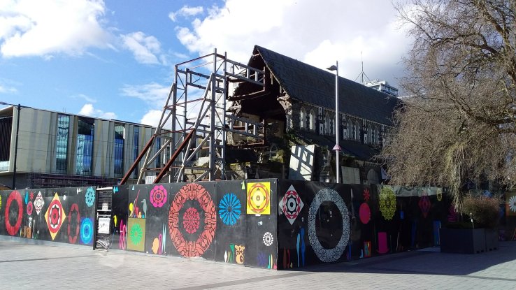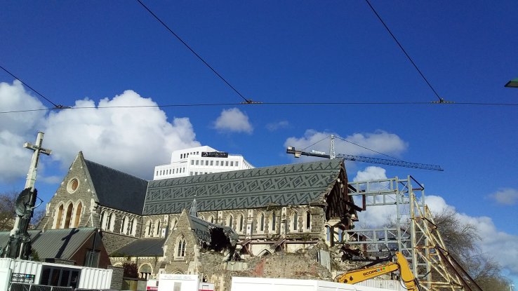 On aperçoit des bâtiments victoriens à moitié effondrés soutenus par d’énormes poutres en métal et notamment la cathédrale dont la tour s’est effondrée, qui se tient sur Cathedral Square et dont les habitants de la ville hésitent encore entre la rénover ou la raser.